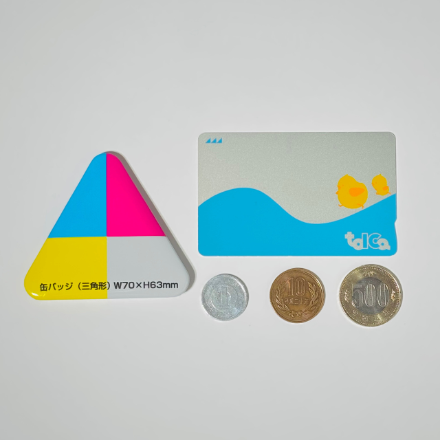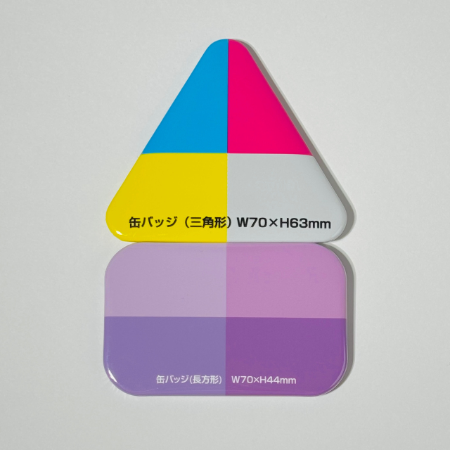 実寸サイズが最大なのは長方形缶バッジですが、三角形は形の特性上「どーん!」と目立つのが特徴です。