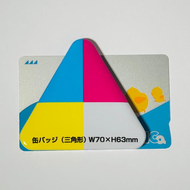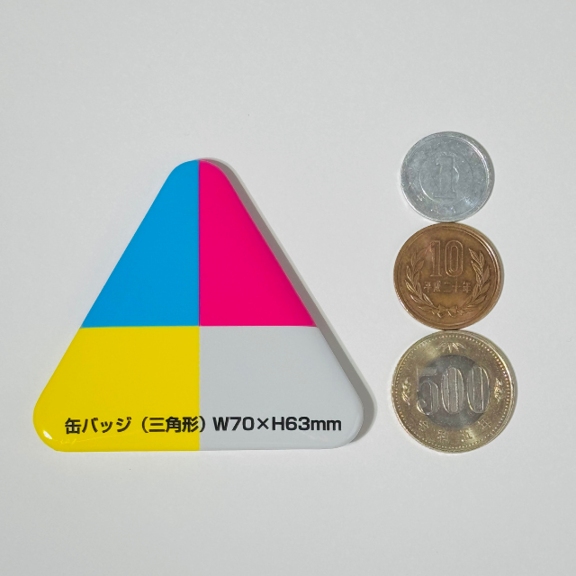 三角形缶バッジのサイズ感|70×63mm存在感バツグン!